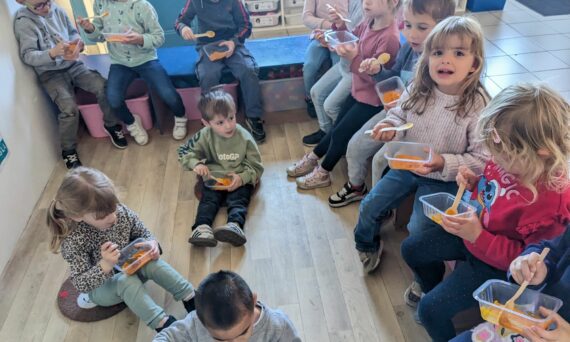La semaine avant les vacances, les élèves de maternelle ont cuisiné à partir de produits de saison pour la semaine du goût. A la manière du livre étudié en classe « Un automne avec Pop », les élèves ont préparé comme le personnage principal un goûter d’automne. Au menu : cookies aux noisettes/chocolat et crème de marron,